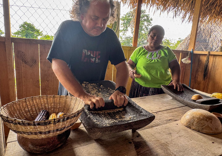 Traditional corn & cacao grinding using a metate stone, followed by handmade corn tortilla preparation
